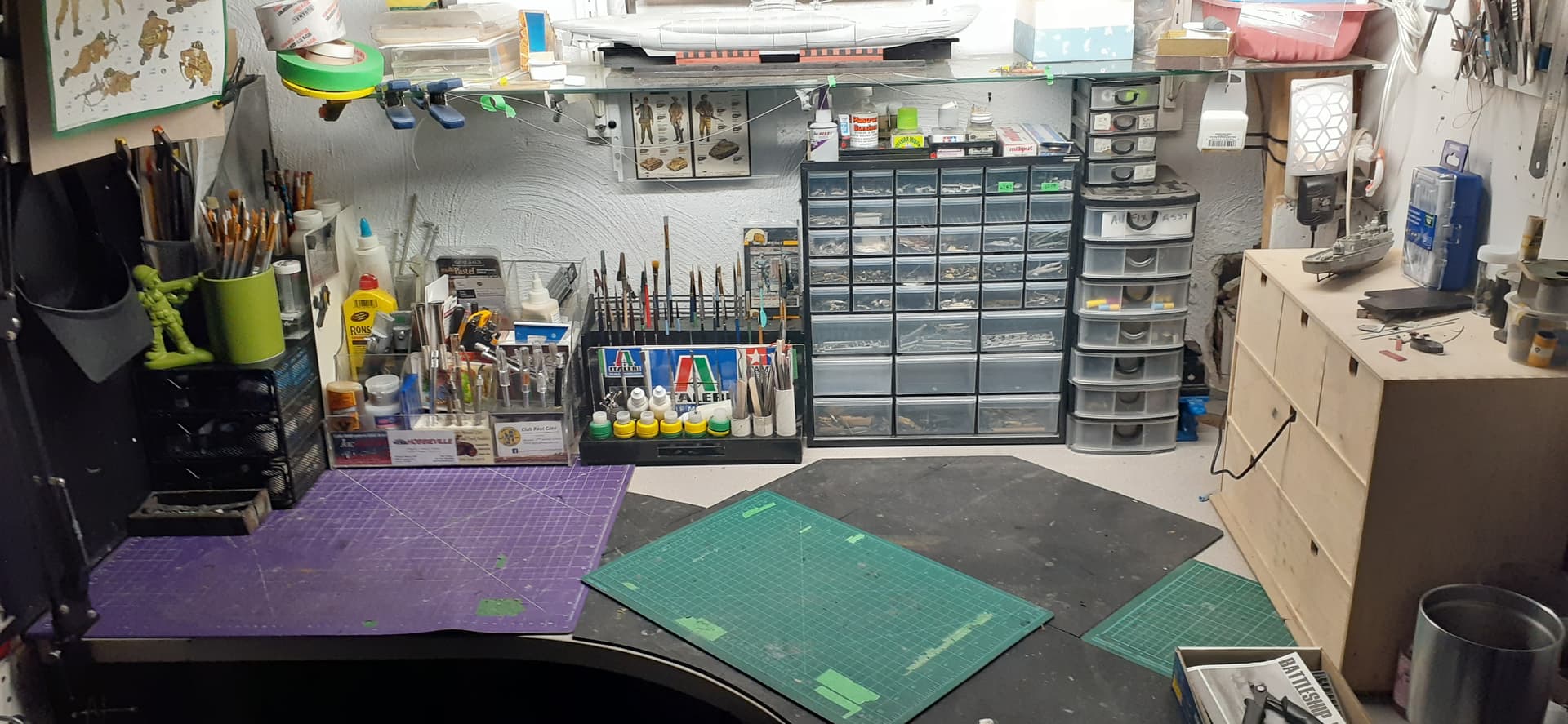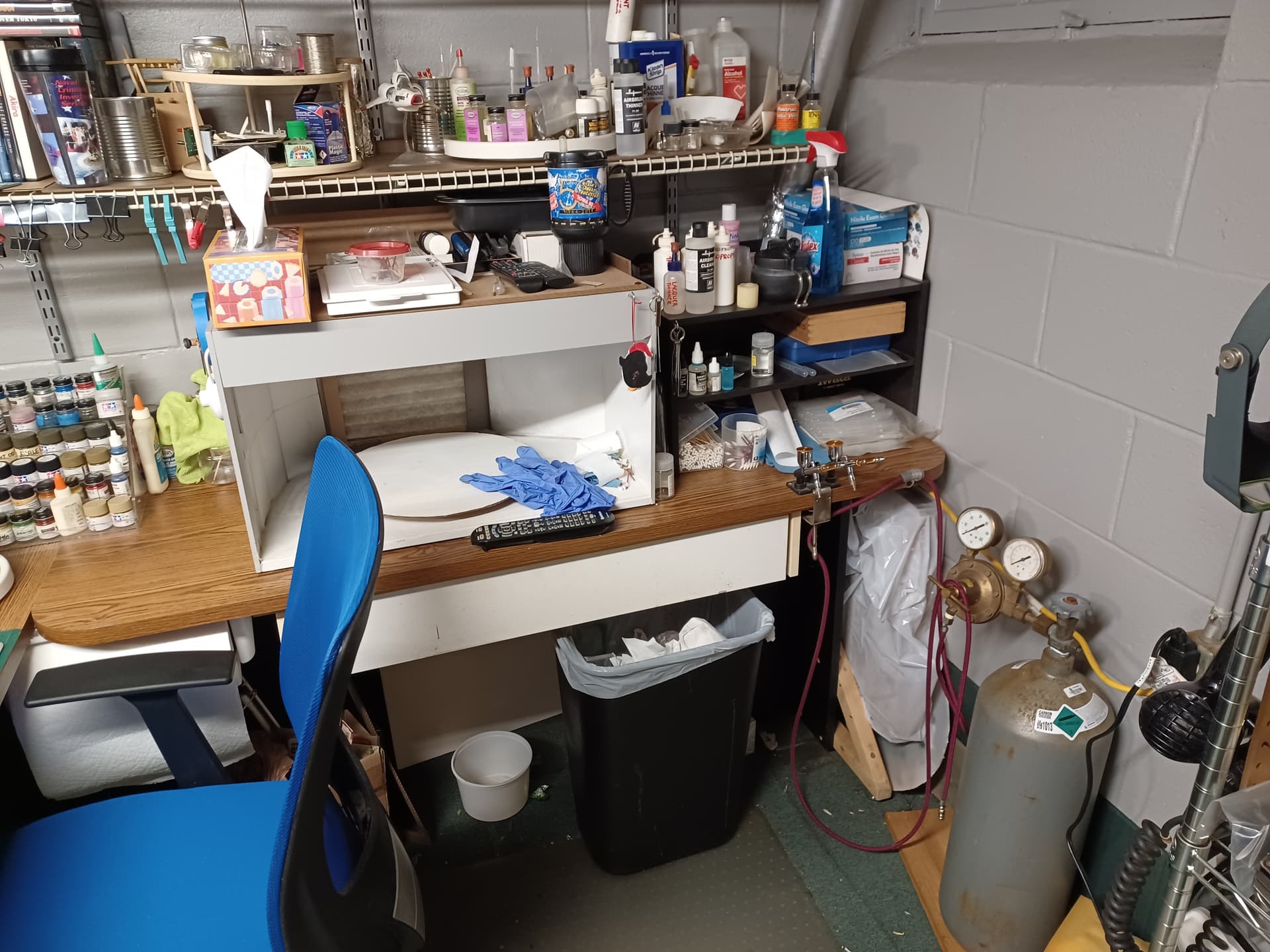 My workspace bench is a “kitbash” of old desks. Nowhere near as elaborate as some but it works. The spraybooth is homemade and vents out the basement window through a series of filters.