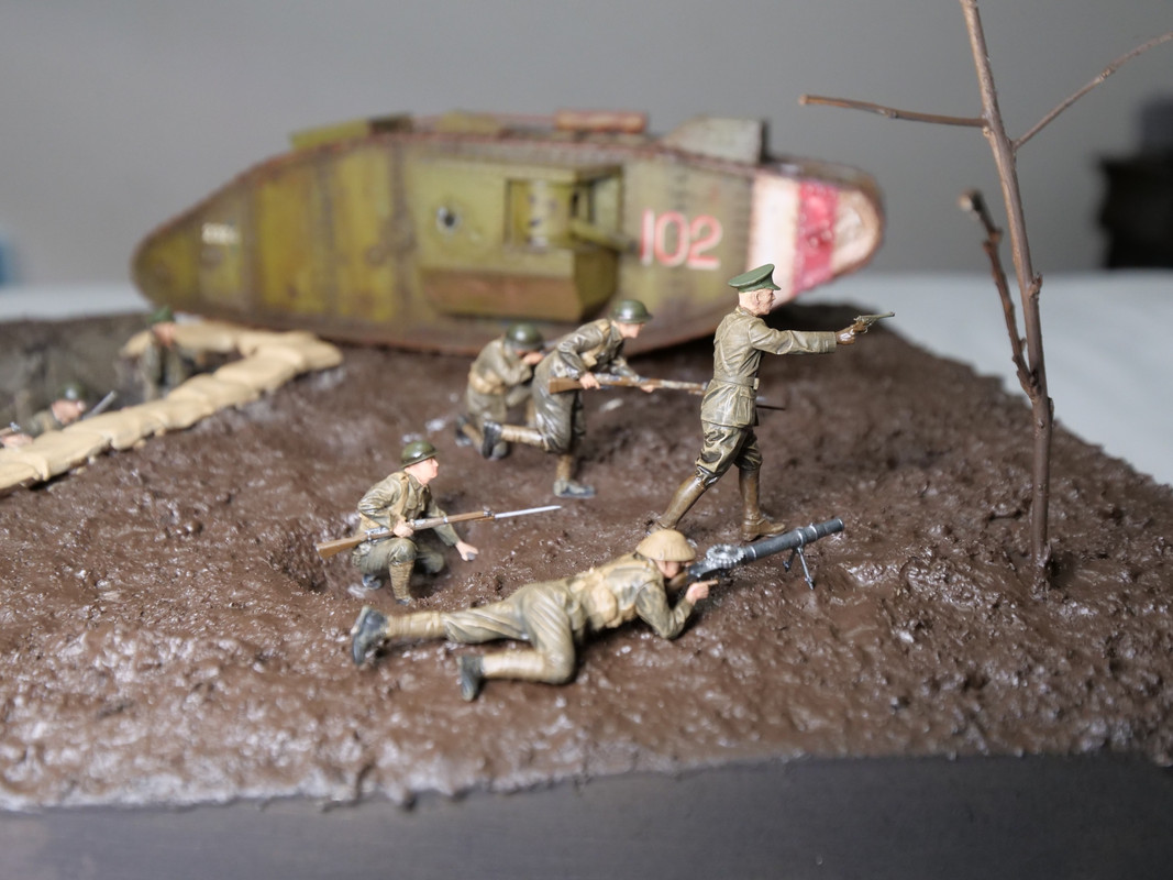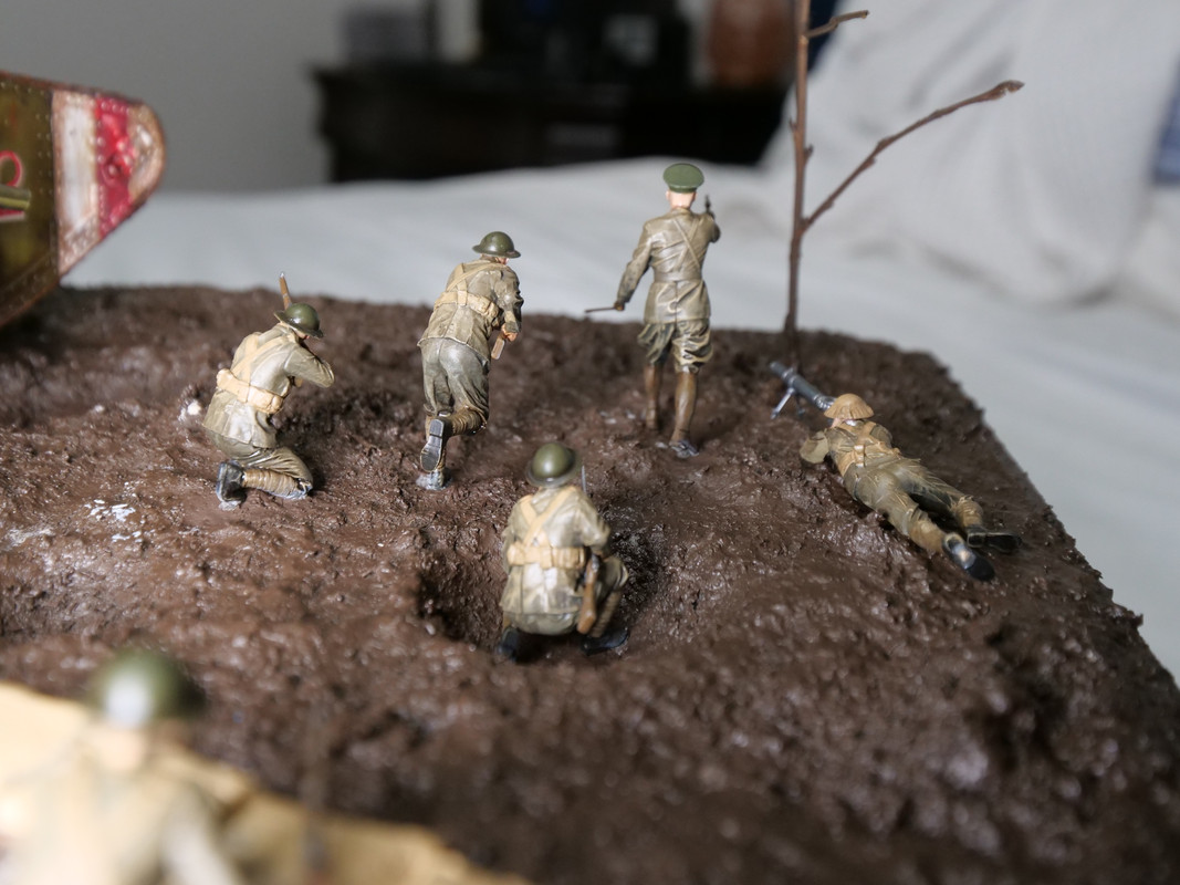 I built this model with my Emhar 1/35 Mark.IV and men from Tamiya’s and Masterbox’s WW1 kits. I built the trenches out of wooden coffee stirrers and the base is made of regular sytrofoam and some plywood. The earth is made from water, plaster, and sawdust. I then painted the base with 50 cent craft store paint and a bit of future. The tree is simply a branch I harvested from a dead tree.