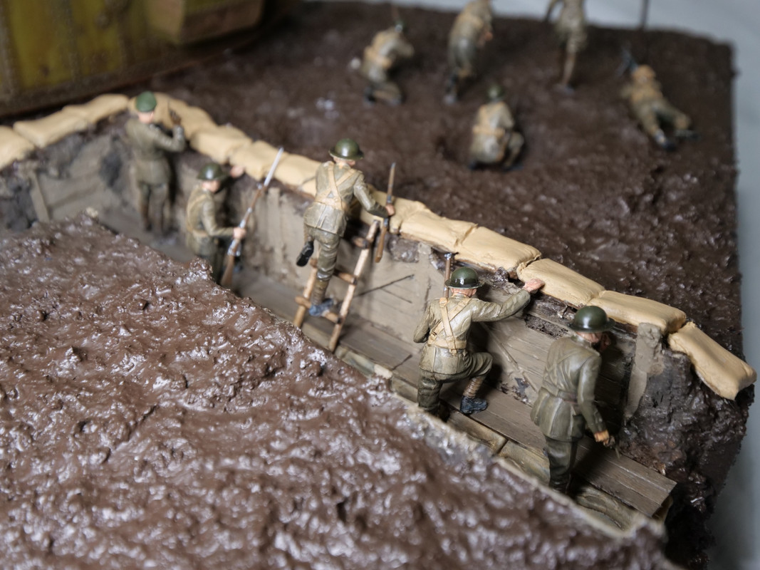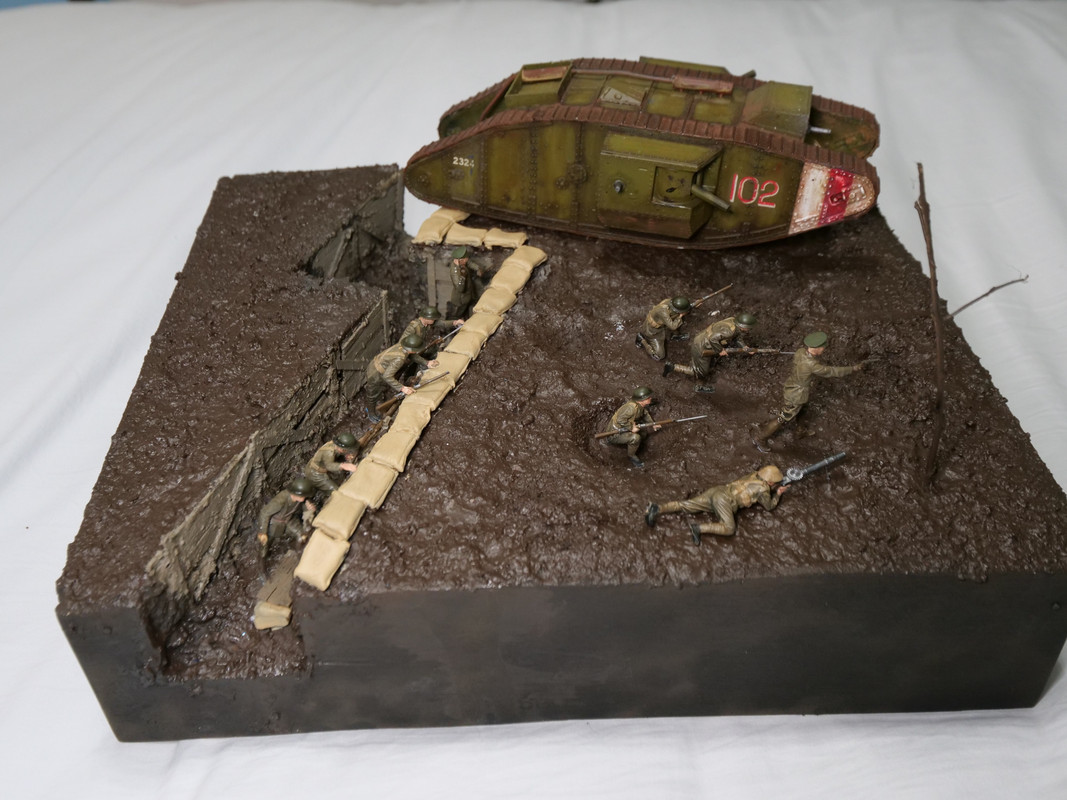 Since you are taking it to a show, some comments seem reasonable. The tank seems out of place. In it’s position, it would have had to back up into it, which seems odd. And it would cave in the wall of the trench.