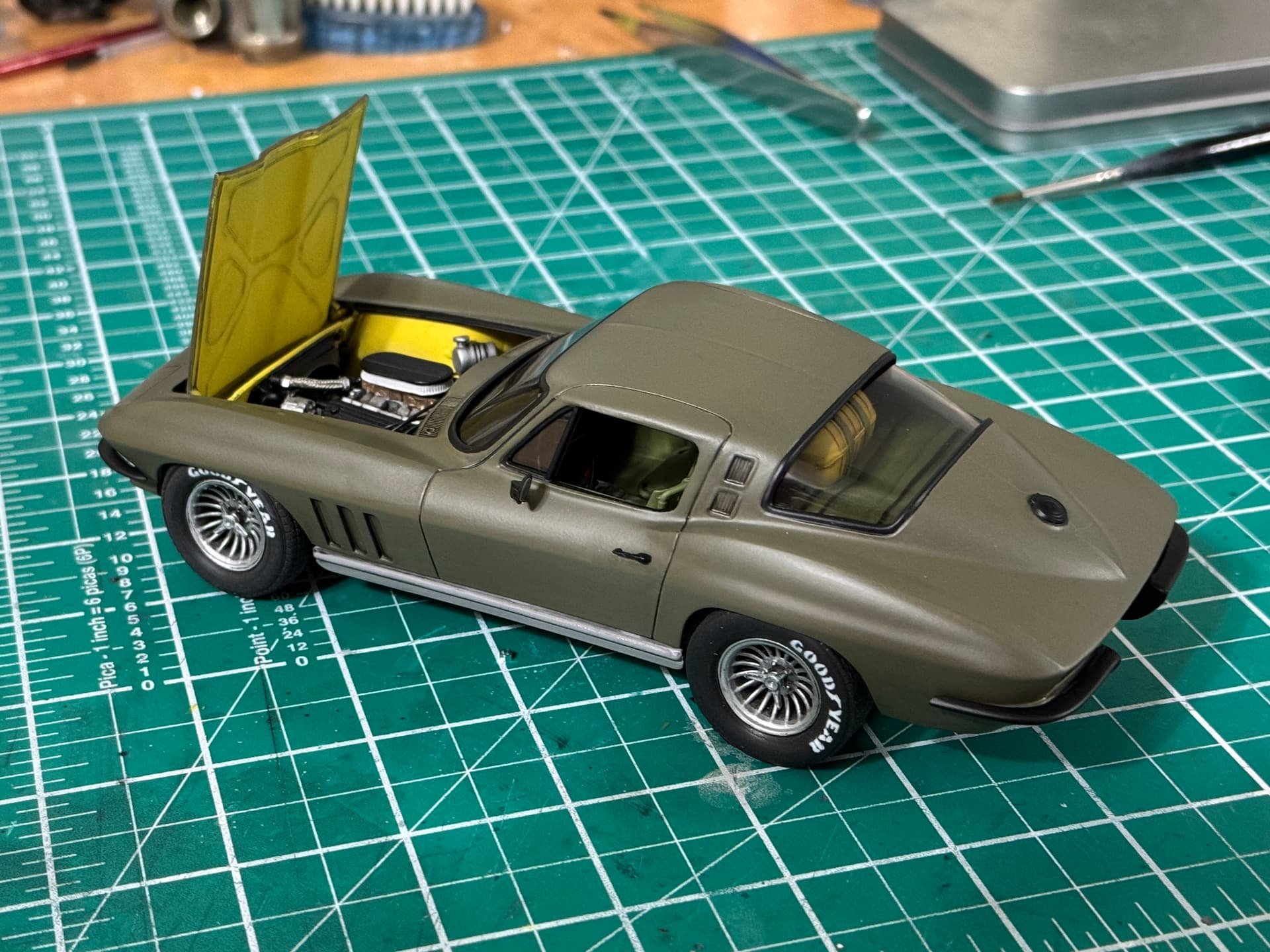 The car looks terrific! I’ve followed this thread from the beginning. I really like the paint, O.D. with the semi-matte finish. Very nice. Your build is inspiration for me to do a similar build. Probably a Ford Mustang. I’ve owned three, the last a 2012 convertible. An excellent build for sure.